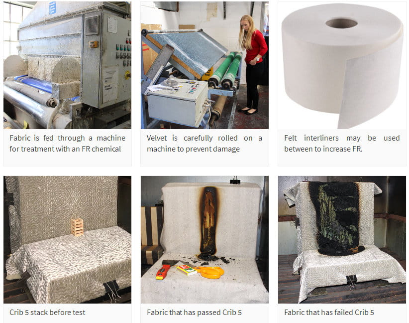 The composition of fabrics differ and their inherent fire resistance varies wildly as a result. Many fabrics can be treated - sprayed on the back with a rubbery chemical - which will stop the fire spreading and help it to burn itself out. Remember that the fabric will always burn, because only the back of the fabric is treated, and acts as a kind of firewall extinguishing the flames when the fabric burns through to it.